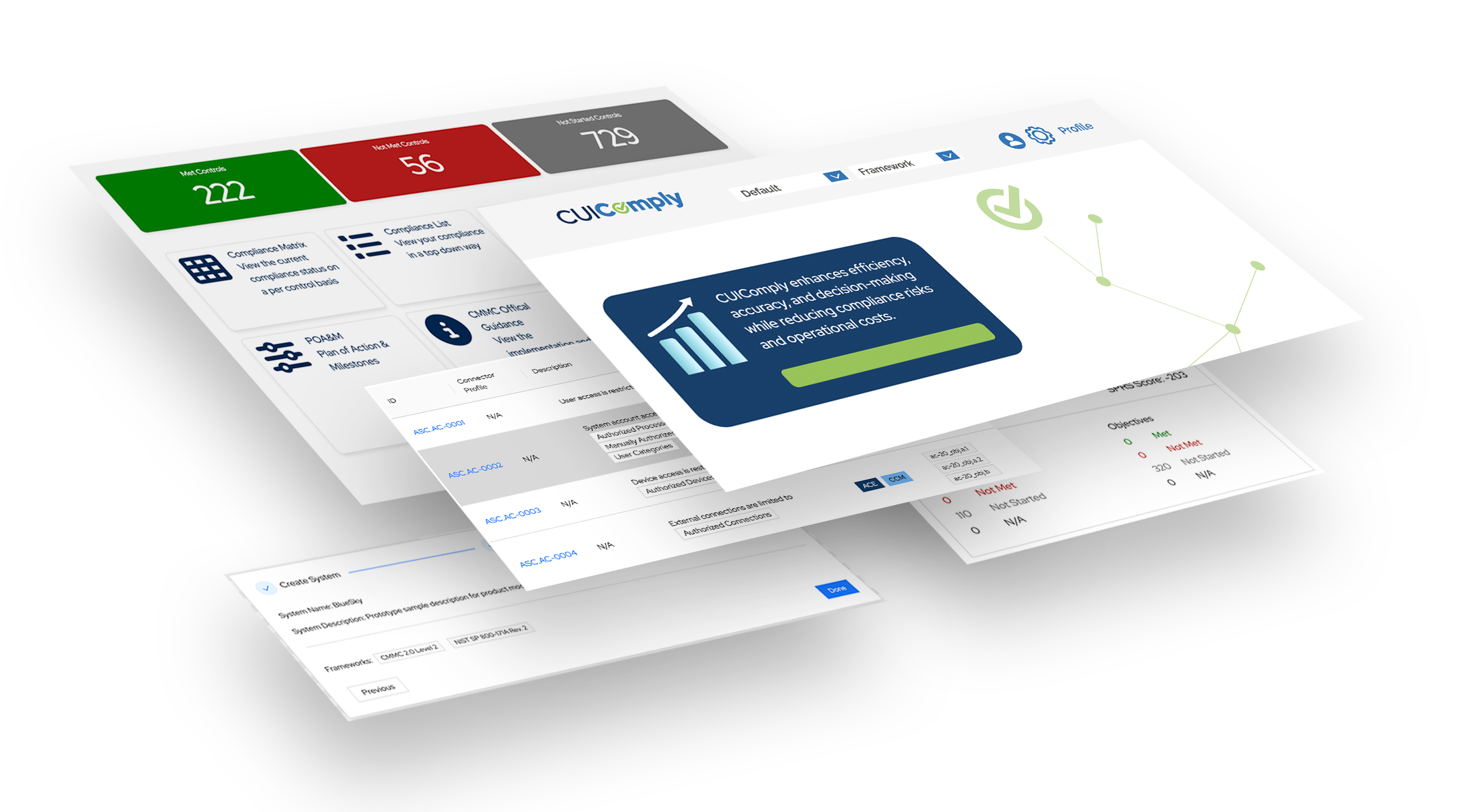 CUIComply removes the repetition and chaos of spreadsheets by letting you enter information once and automatically mapping it everywhere it’s needed. With our CMMC software, you can: